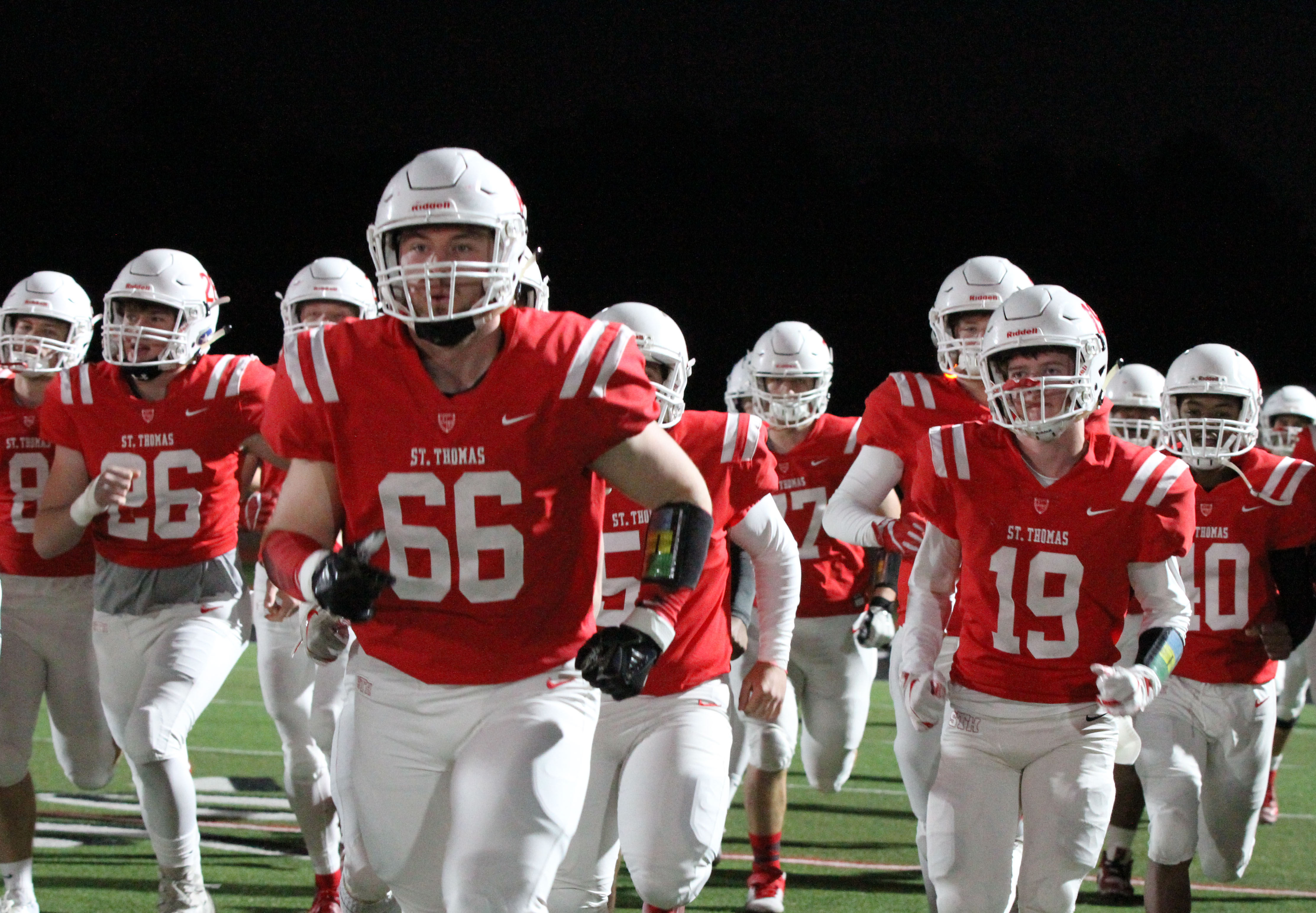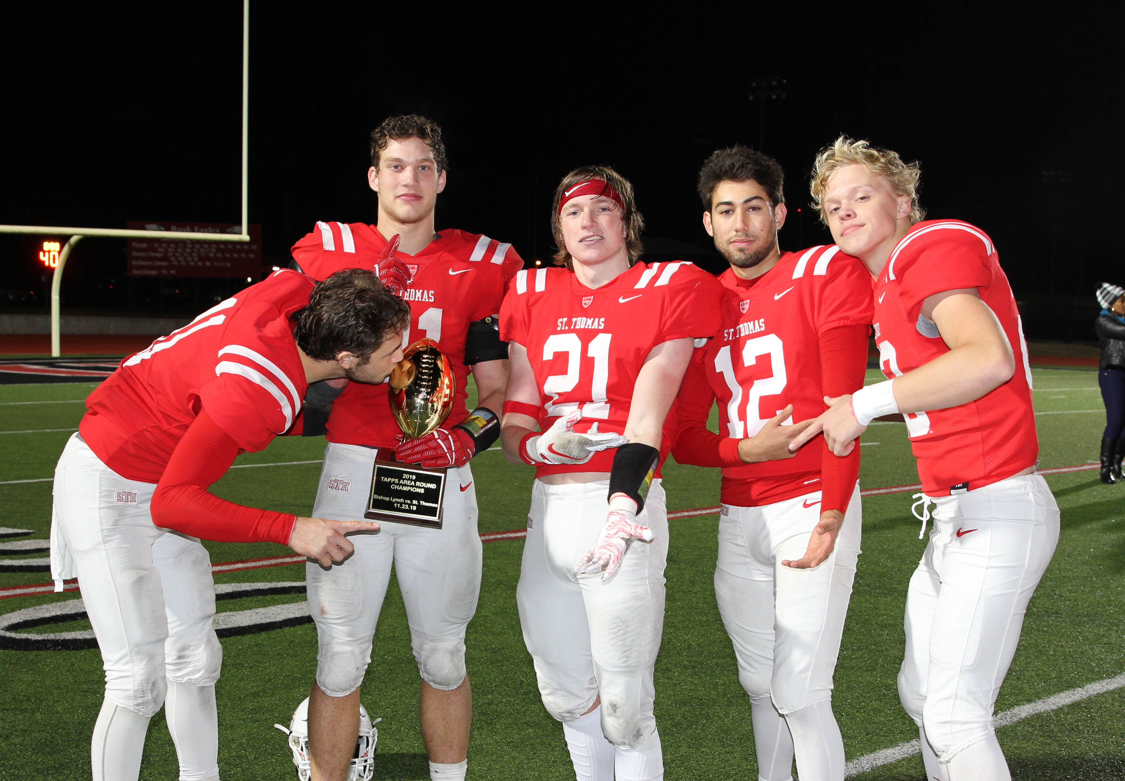 The array of marauders flanked by linebacker Cooper Thomas ’20 (verbal Columbia University) who was part of 13 tackles and defensive manchild Chidera Umeh ’20 smothered Bishop Lynch to only 243 total yards, one single solitary first down in its first four possessions, and one measly third down conversion in eight attempts. The Friars wheezed to a lone scoring drive aided by a face mask penalty and were pronounced DOA when linebacker Vince Lee ‘21 (part of 9 tackles) collected the third St. Thomas takeaway with 2:22 remaining in the game.